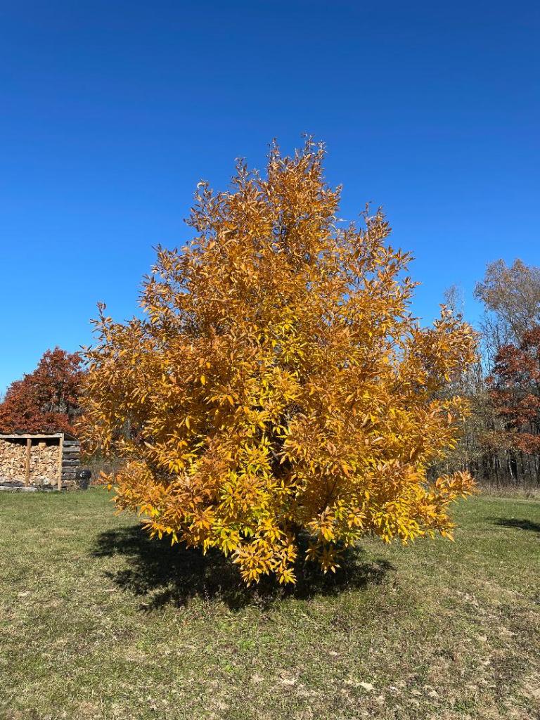 The story behind this tree was that I sent to a nursery to purchase some chestnut seedlings trees to plant. I received a half dozen seedlings and nurtured them in small pots for about a year to get them a head start before I planted them on my property. 6 were planted and only 1 survived. Being a novice to chestnut trees and what was needed to make them grow and produce chestnuts, I watched this tree grow for 5 years. At some point, I figured that I would miraculously get a harvest of chestnuts. After the fifth year in which I thought I would get some chestnuts, I researched and found out these facts about chestnut trees. First, you need more than 1 tree to cross-pollinate, Second, was that the tree I thought was chestnut was in fact turned out to be a saw-tooth oak tree, obviously, that was the biggest factor in not getting chestnuts! It’s a beautiful tree that turns bright yellow gold in the fall and has a great shape to it.
