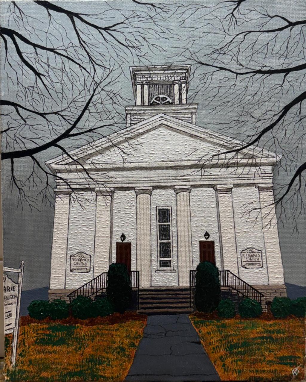 I took a picture of the church this past winter, in March of 2026. The snow finally melted, but it was still a grey, wintry day. The 2 large maple trees in front of the church were bare of leaves, and it captured an interesting type of haunting view of the church. The grass in front lawn had a little bit of green but mostly browns and yellows of winter’s grip. I worked on adding the texture of the whitewashed bricks to give the painting some depth and an almost 3-dimensional feel.