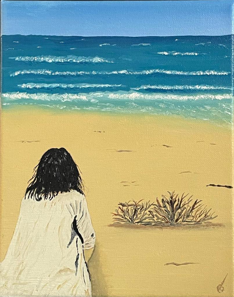 Girl looking at the Ocean Gold Framed – Oils on canvas – 8×10