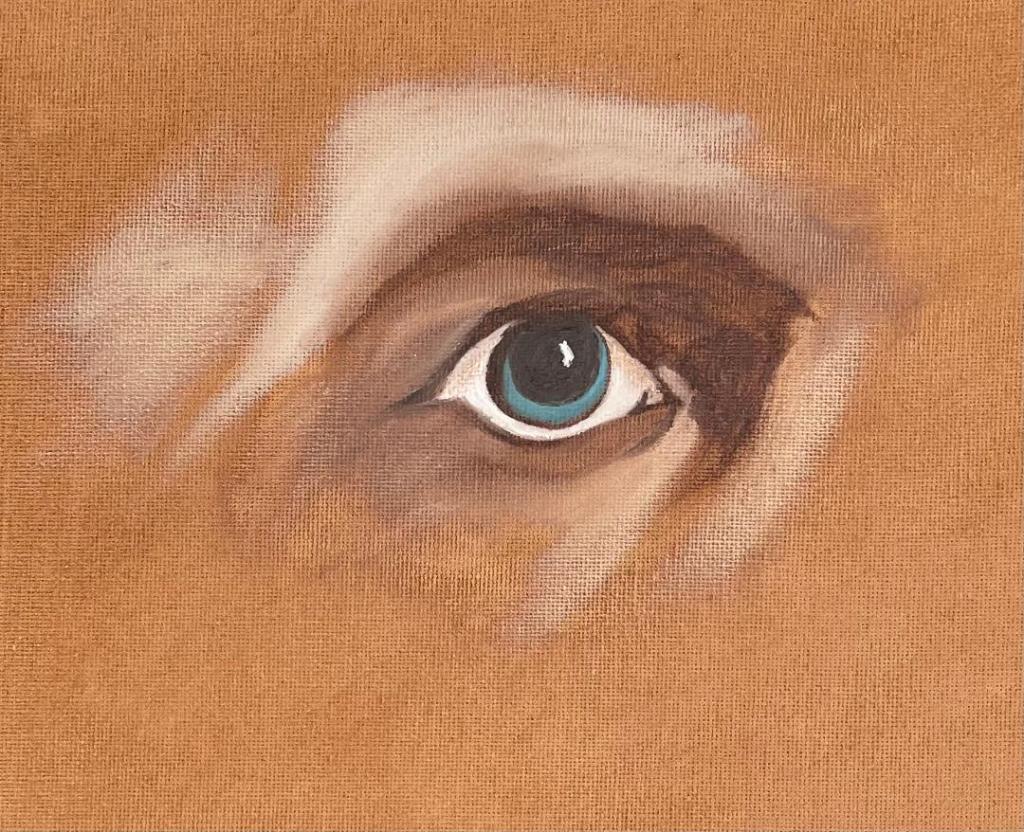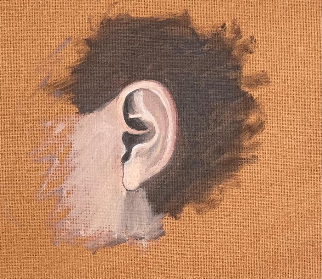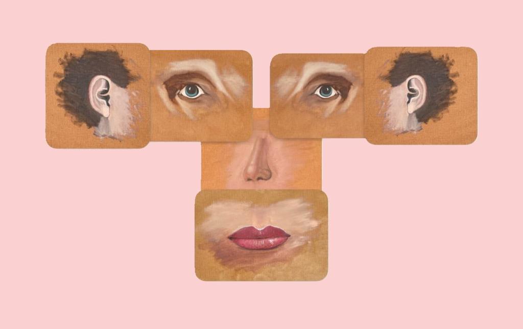 Girl looking at the Ocean – Oils on canvas – 8×10The eye – Oils on canvas paperThe Nose – Oils on canvas paperThe lips – Oil on canvas paperThe Ear – oil on canvas paperThe Monkey – Digital blocks of pictures of the oil body parts.