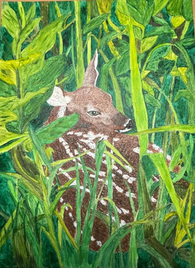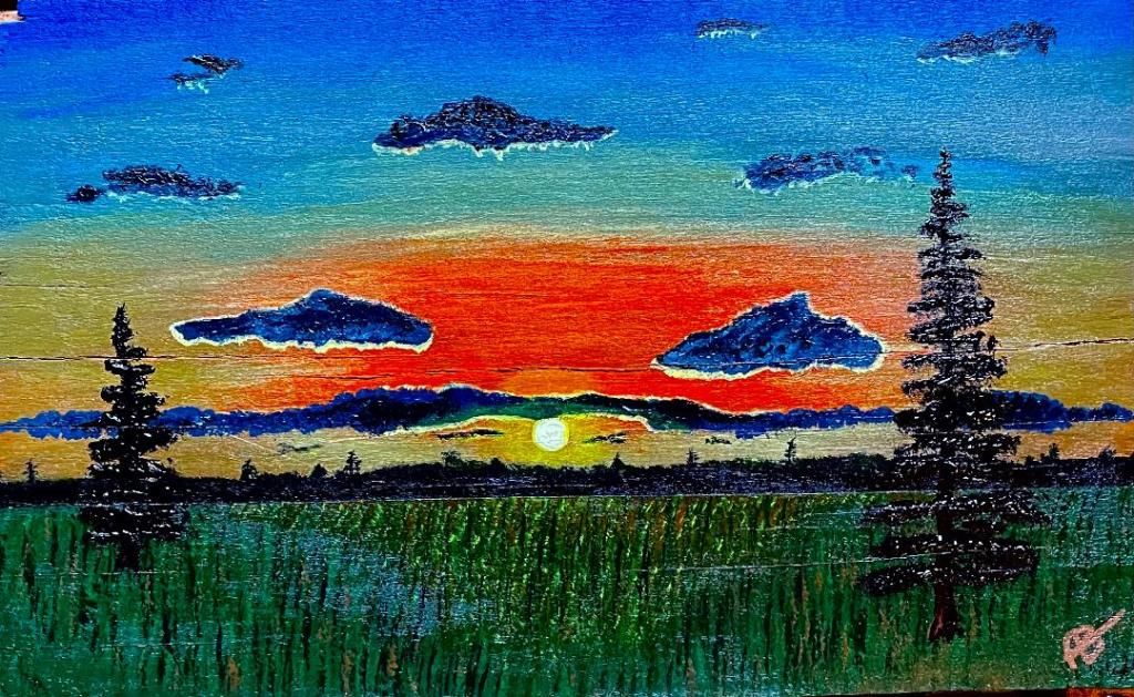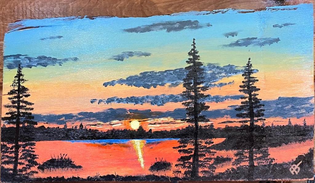 Fawn in High Grass – Acrylics on canvas board-9×12Rustic Church – Acrylics on canvas board-8×10Sunset on Evergreen Lake – Acrylics on wood slab – 6.5″ x 11.25″